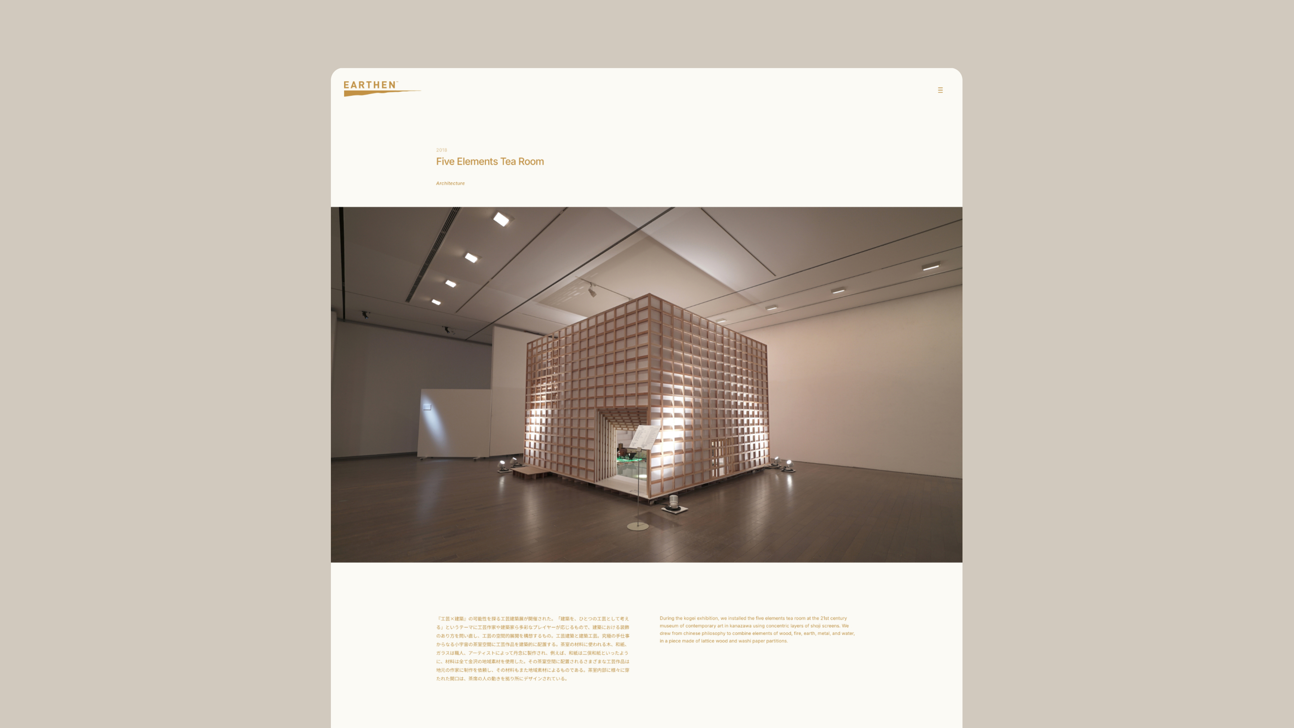 EARTHENのロゴとウェブサイトを制作。陶芸の伝統に根ざす思考をロゴに凝縮し、そのロゴをシステムとして展開するウェブデザインで表現しました。素材感と明快性のバランスを軸に、建築からプロダクトまで多様な活動を一貫して発信するデジタル空間を実現しています。