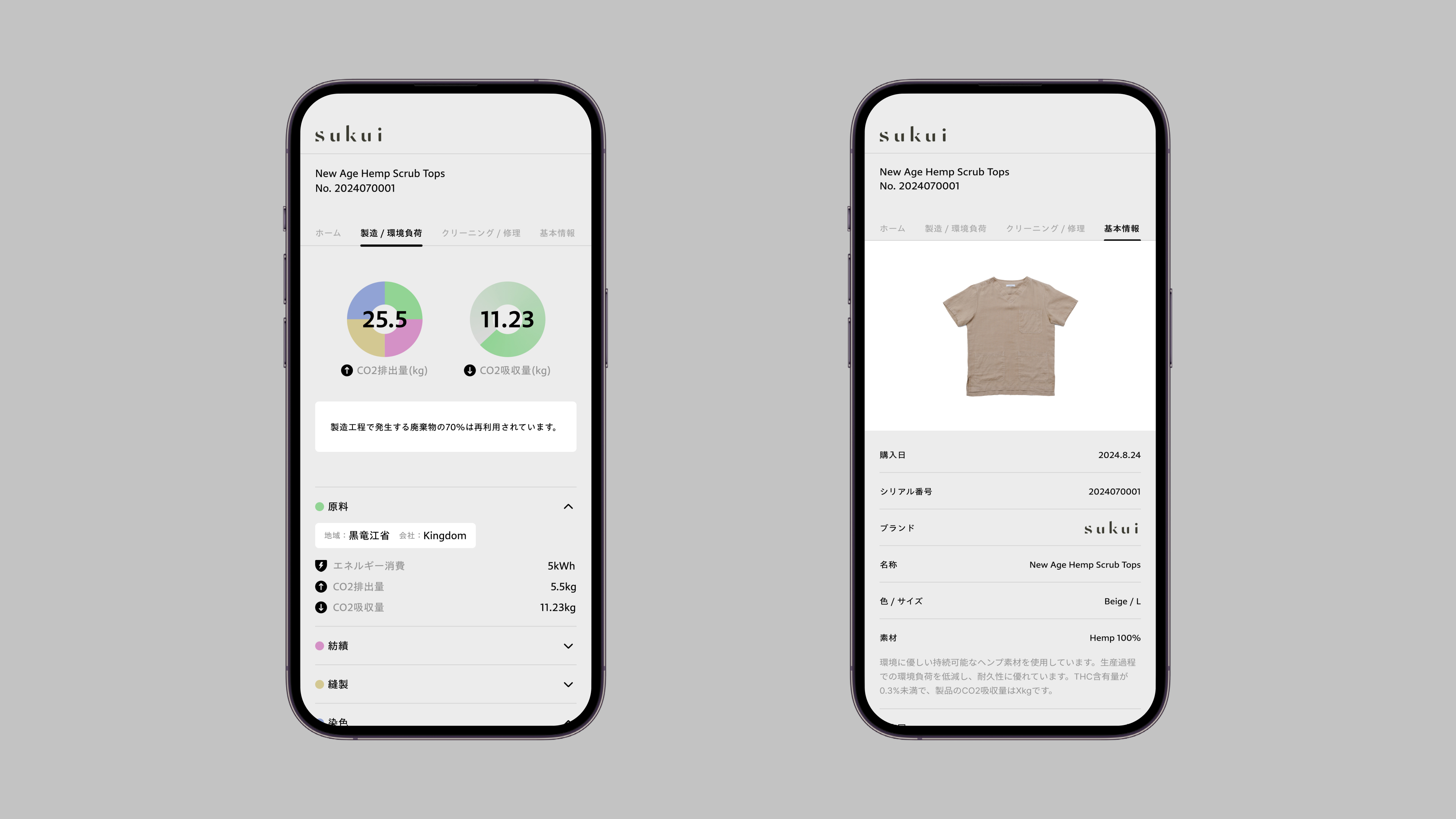 医療従事者向けサステナブルウェアブランドsukuiのデジタル製品パスポート(DPP)のウェブUIを設計。CO₂排出量や素材の由来など、「情報を知る」という行為にシンプルさと優しさを持たせることを意識しました。情報の追加や拡張にも柔軟に対応できるUI設計で、サステナビリティの透明性を自然に届ける体験を実現しています。